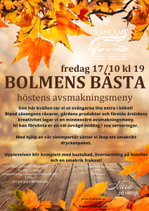 Bland säsongens råvaror, gårdens produkter och förstås årstidens kreativitet lagar vi en minnesvärd avsmakningsmeny.