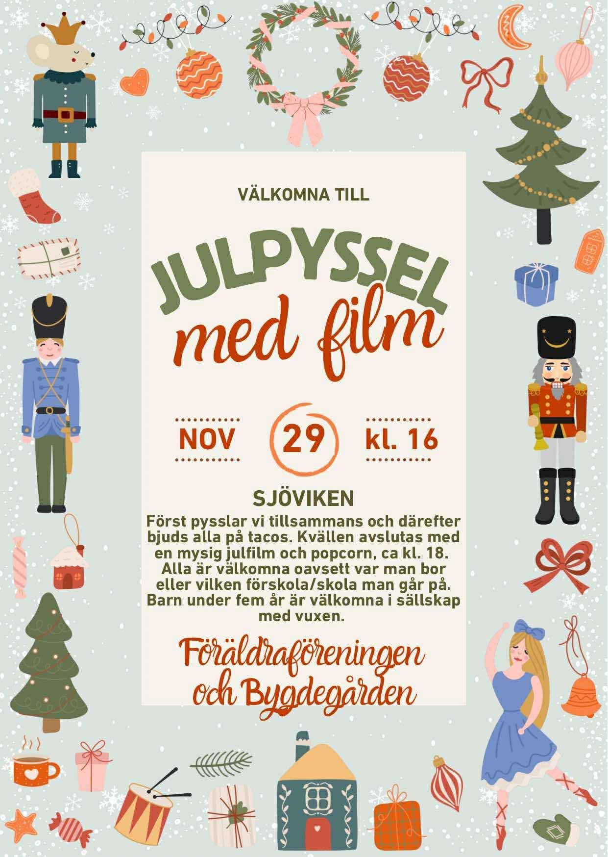 Först pysslar vi tillsammans och därefter bjuds alla på tacos. Kvällen avslutas med en mysig julfilm och popcorn, ca kl. 18. Alla är välkomna oavsett var man bor eller vilken förskola/skola man går på. Barn under fem år är välkomna i sällskap med vuxen. 🎄 Föräldraföreningen och Bygdegården 🎄