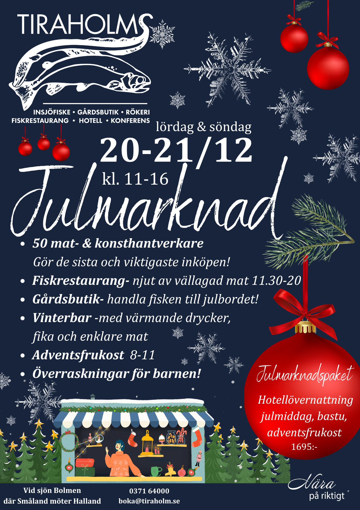 Välkommen till en stämningsfull julmarknad vid sjön Bolmen!Här hittar du:• 50 mat- & konsthanterverkare – gör de sista och viktigaste inköpen!• Fiskrestaurang – njut av vällagad mat kl. 11.30–20.00• Gårdsbutik – handla fisken till julbordet• Vinterbar – med värmande drycker, fika och enklare mat• Adventsfrukost kl. 8–11• Överraskningar för barnen! ✨ Julmarknadspaket ✨Hotellövernattning, julmiddag, bastu…
